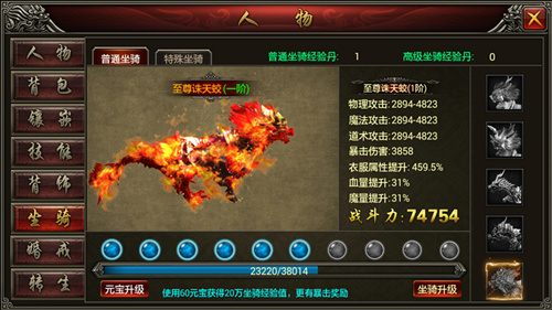 玩家初期,会疲于在各个地图奔波,而当玩家达到57级,完成指定主线任务后获得第一个坐骑:黑鬃马。当玩家使用坐骑经验丹,便可以使坐骑一步一步进阶,不但可以获得属性的提升,更可以使坐骑的外观外获得变化。