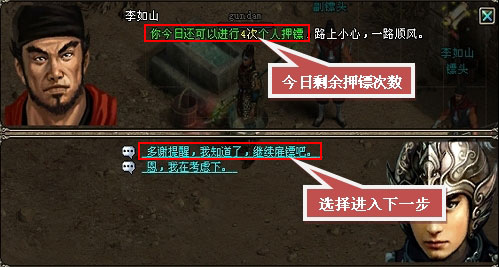 ⑤ 点击图(4)红色区域后进入下一步,会提示你今天还可以进行的押镖次数。如图(5):