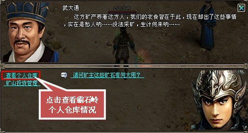 ② 通过与矿主对话查看个人仓库确认自己的矿石储存数量。(矿石可通过每日活动“不干净的矿洞”和“矿山投资”获得),如图(2):