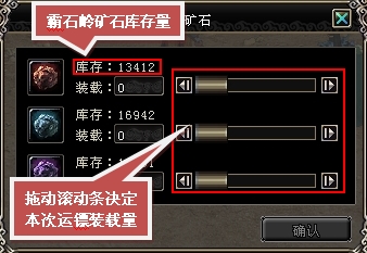 ⑥ 进入装载矿石界面,如图(6),选择你想在本次押镖过程中装运的矿石数量。单人押送镖车时,矿石上限为20000: