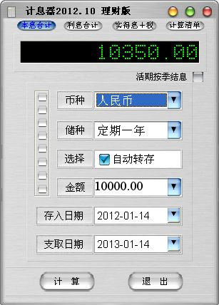 您有一张老存单已经自动转存了几年,想知道它的利息有多少了吗?您有外币存单想在取出来之前试算一下利息吗?使用这个银行利息计算器软件吧!