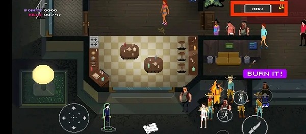 1. 刚进入时,界面是英文的,不用担忧。先点击“杀”通过训练关卡,正式进入第一关后,再点击右上角的菜单。