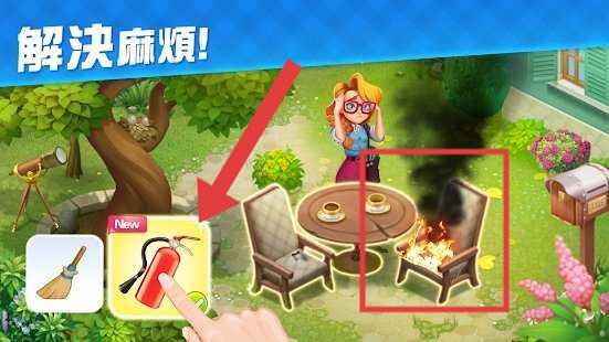 3、倘若碰到庭院里的麻烦事(比如着火的椅子),点击箭头所指的灭火器道具,以此解决问题,推动家园修复进程,进而解锁新区域。
