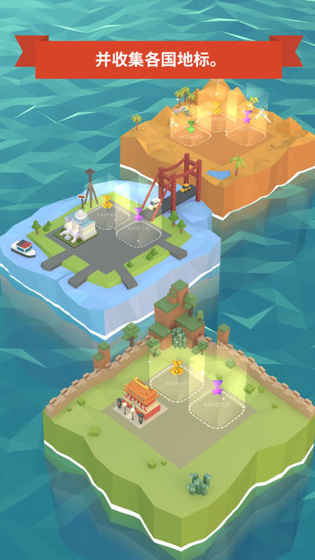 3、勇闯丰富多样的关卡,同时收集各国地标建筑,逐步绘制出属于你的世界地图。