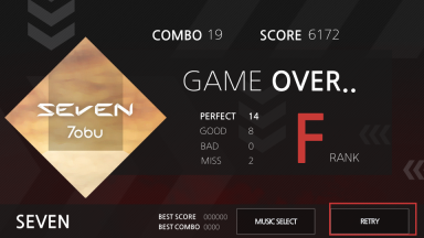 3、要是挑战失败,点击“RETRY”可重新开启本关,还能通过“MUSIC SELECT”更换曲目,接着在节奏跑酷里努力获取高分。