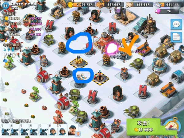5、适用于具备一定防御等级,然而防御建筑分布太过稀疏的阵型。案例中的进攻策略为:精确计算能量,在推进的同时,依靠能量炸毁那些即将构成威胁的目标。
