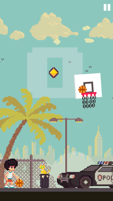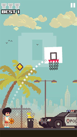 玩家的任务是操控小男孩进行投篮,只需按住屏幕,小男孩与篮筐之间便会自动浮现一道弧线。