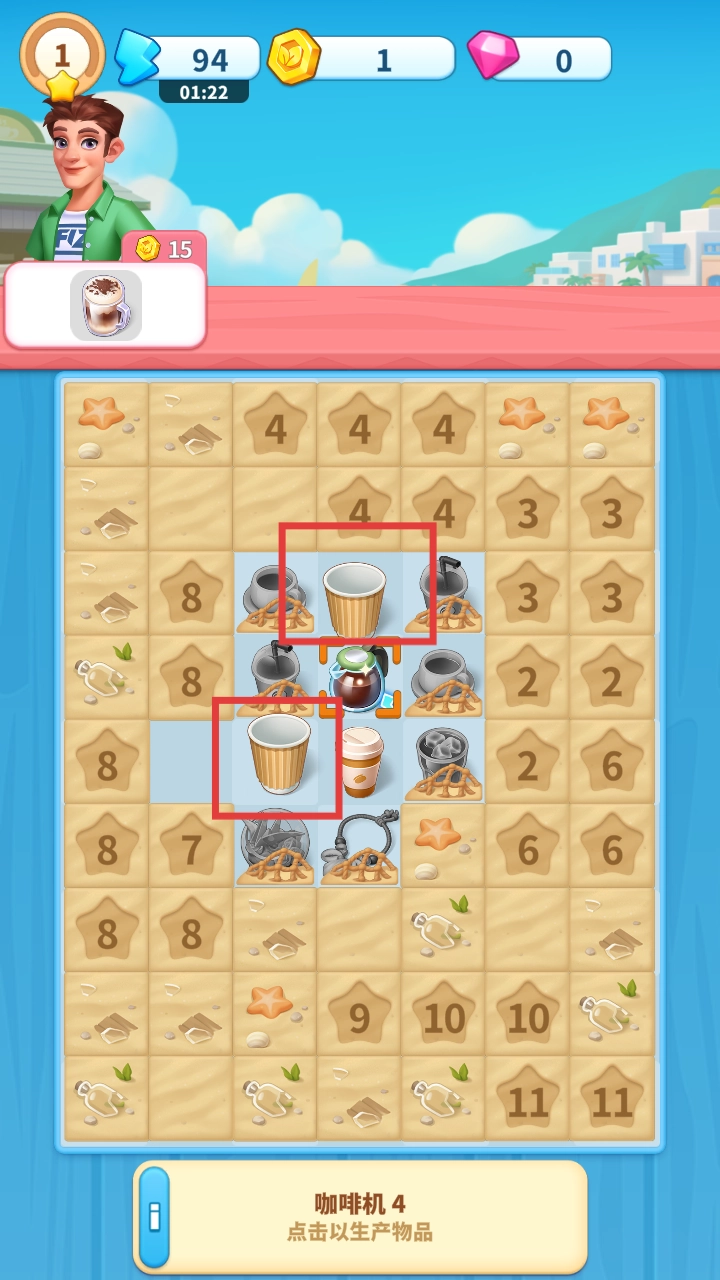 3、接着在棋盘上寻觅,将红框里新冒出来的相同咖啡杯予以合并,从而获取更高级的物品。