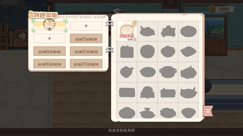 5、踏入餐厅后,点击菜单板就能添加各类不同的菜品。而且餐厅等级越高,可售出的菜品数量也就越多。