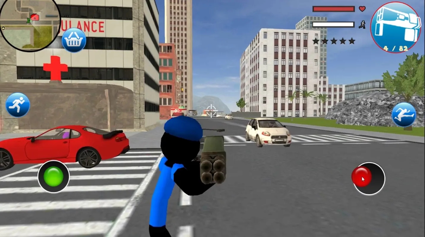 左侧移动、加速,右侧绳索,攻击(跳跃),跳跃,右上侧的武器更换以及血量、经验的显示都实时更新,一览无遗,凭借着大家自由的玩法,与其他帮派的人物进行交火,期间杀人能够获得经验,杀多了会产生星级,警察和其他附近角色会特殊照顾你对你展开火热的进攻,而如何存活,如何将其他人物击杀则是你所需要完成的任务。