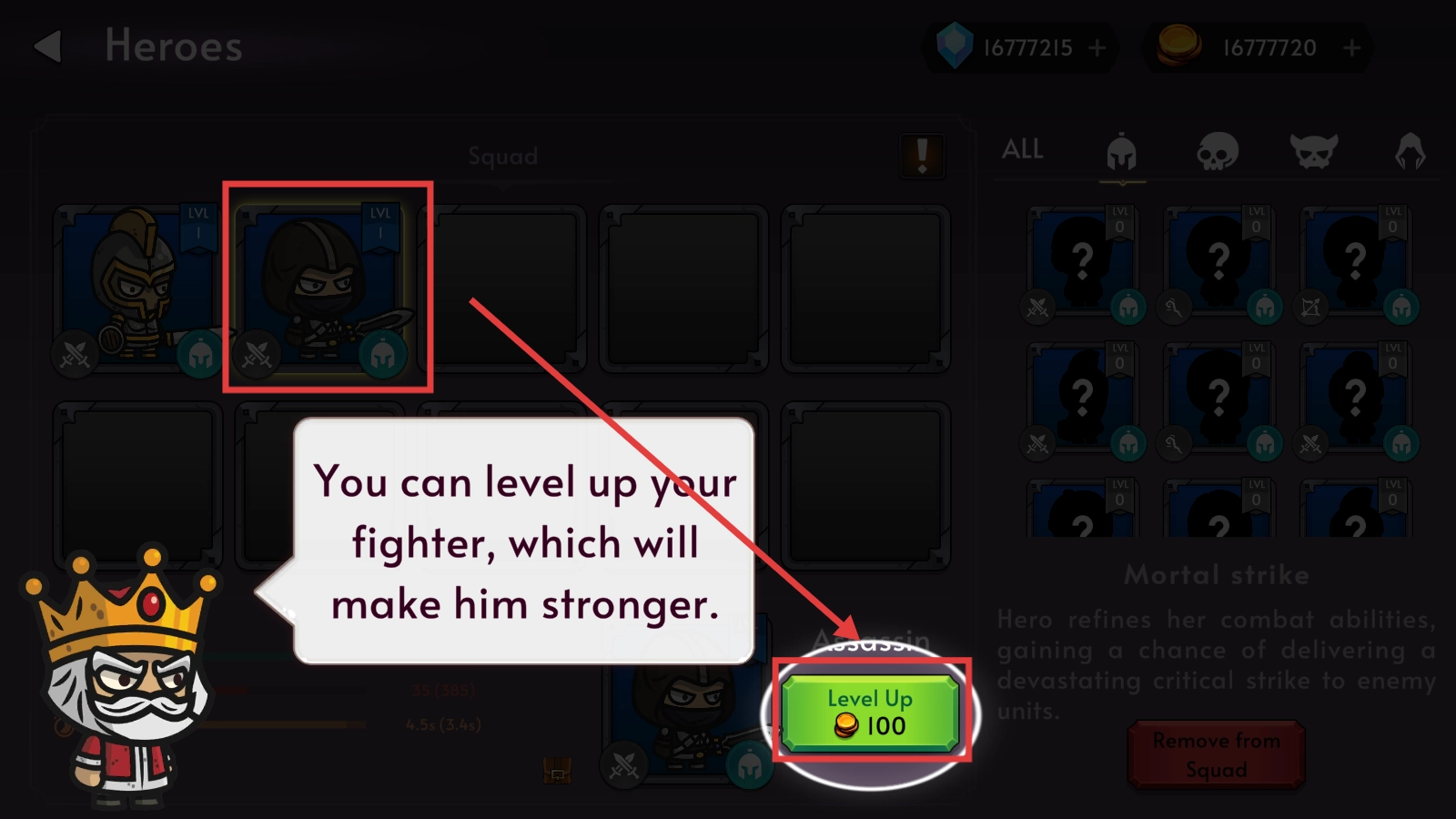 1. 在英雄界面里,选定想要培养的英雄,点击【LevelUp】,通过消耗金币来实现升级,从而提升战斗力,为战斗做好准备。
