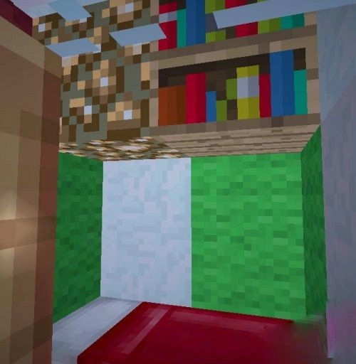 6、接着以床的全红色部分作为中心,向左延伸2格,向右延伸1格,形成一个边长为4的正方体支柱。需要留意的是,为了让其更具层次感,绿色颜色带的位置不要与褐红色颜色带的位置处于平行状态。
