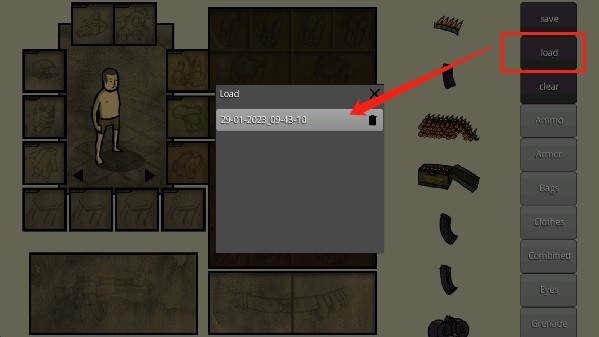 5、点开如下图所示的“load”,选中刚才保存的存档,就能快速生成搭配。