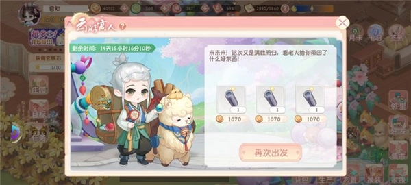 云游商人带回的材料,来自你所接的三种任务(星君任务、灵气任务、九个悬赏任务)中的任意一个,优先提供你库存中没有的。