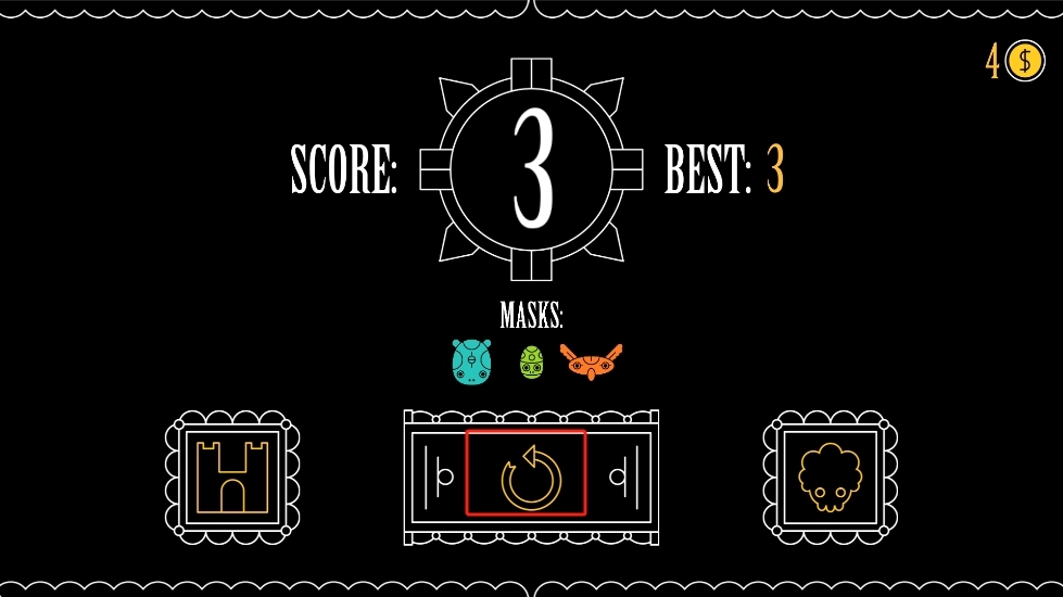 3、完成结算后,要是你想挑战更高的分数,点击界面中间的循环箭头按钮,即可重新开启游戏,努力收集更多面具角色。