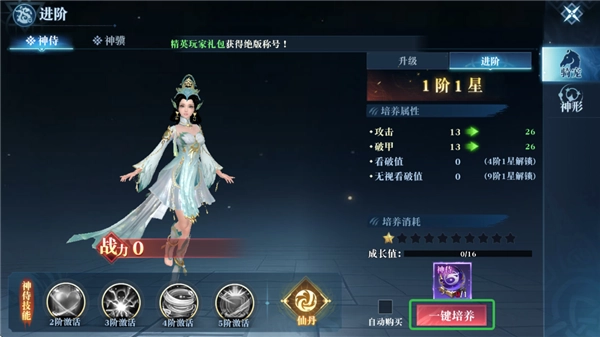 进行神侍进阶操作,不但能够提高神侍的攻击、破甲等数值,而且还可以使其技能得以激活。