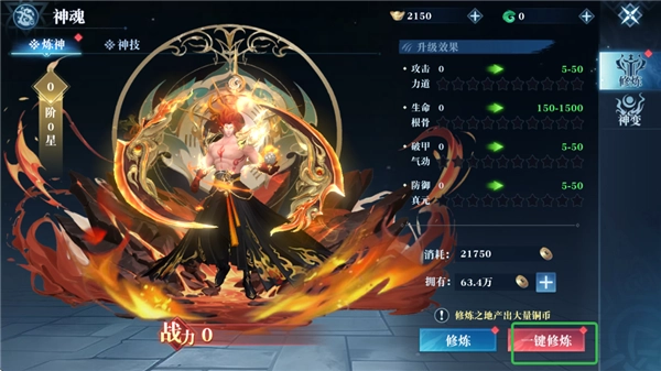 玩家能够耗费铜币来对神魂展开修炼,如此一来,在攻击、生命以及破甲这些方面都会获得提升。