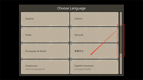 1. 首次进入游戏时,需手动选择语言,向下滑动找到“繁体中文”,点击便可完成切换。