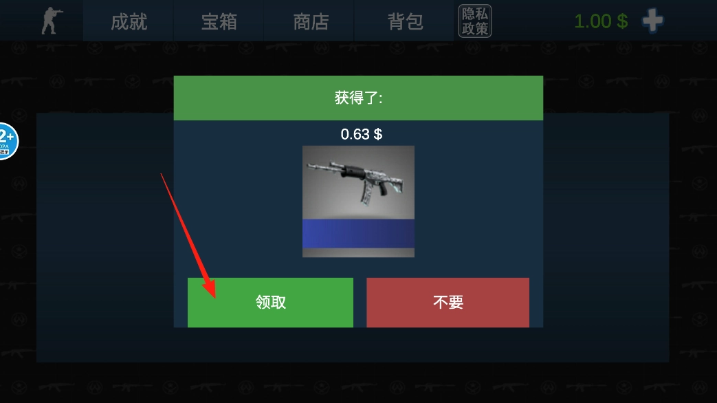 2、开启宝箱后,会弹出奖励界面,上面显示获得0.63$以及一把枪。若想将这些奖励收入自己手中,点击领取按钮即可,这样就能把钱和武器存到个人账户里,随后还能继续开启其他宝箱。