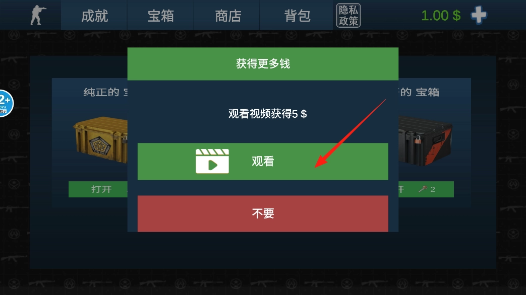 3、若想赚取更多金钱,界面会弹出“看视频得5$”的选项,点击观看按钮,待广告播放完毕,即可获得5$奖励,此奖励可用于开启更多宝箱或购买商店道具。
