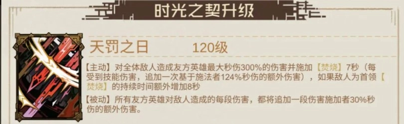 核心【天罚之日】: 天罚之日的被动效果可使每段伤害均获得固定30%秒伤的倍率提升;其主动技能则能为每次技能伤害附加124%秒伤的增幅效果。