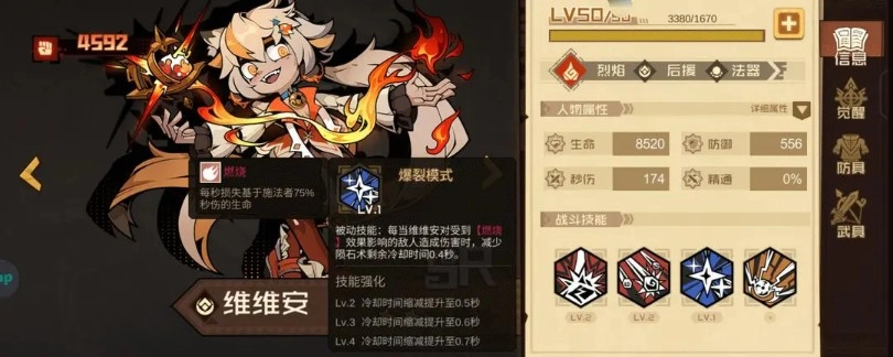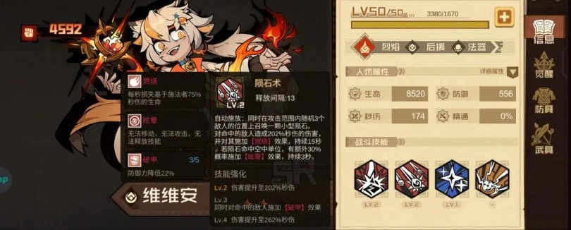 维维安的角色定位为辅助输出,其核心作用是为沙拉曼施加燃烧效果,通过高频触发自动技能来激活沙拉曼的被动机制,同时补充一定的伤害输出,此外她与天罚之日的机制具有高度适配性。