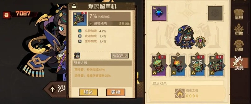 沙拉曼的输出表现中,技能伤害占据了绝对主导地位,因此在选择回响时,搭配能够提升技能伤害的强者之魂会是更优的选择。