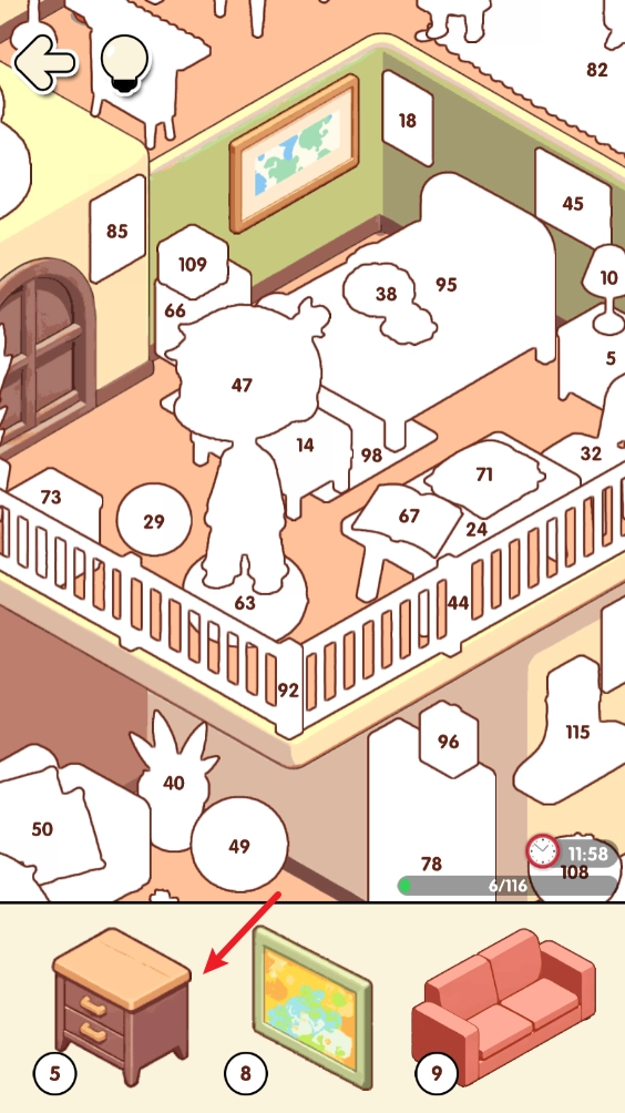 适合低龄儿童的益智类桌面小游戏,学龄前后的孩子基本都能独立操作。这类游戏的关卡通常包含上百个带编号的模块,每个模块的编码都和场景中的对应位置精准匹配。游戏设有计时机制,若未能在规定时间内完成当前关卡,只能通过观看广告获取额外时间,或者选择重新挑战该关卡。