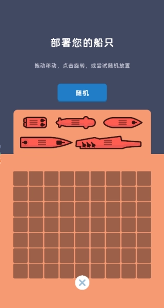 在这款海战主题的游戏里,你可以自由规划舰船的阵位:通过拖拽操作调整它们的位置,点击则能改变舰船朝向,也可以选择让系统随机安排布局。