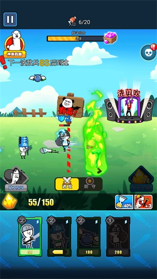 同时,游戏内还设有一张超大地图,上面分布着滑稽草原、尼玛山脉、逮虾沙漠、狗头岛、虾米海滩和沙雕雪地等各具特色的关卡。这些不同地理位置的关卡对应着不同级别的难度挑战,所以你需要合理组合搭配更多兵种,才能完成统一世界的目标。