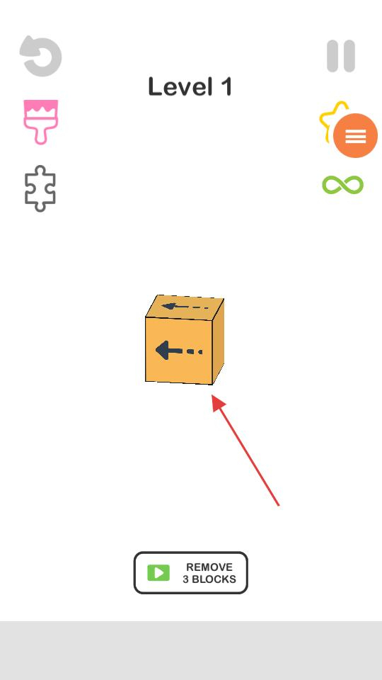 1、基础消除规则:点击向外箭头可完成基础消除操作,长按该箭头能够预览飞行路径,当遇到阻碍物时会自动停止移动,因此需要优先清理阻挡路线的基础方块。