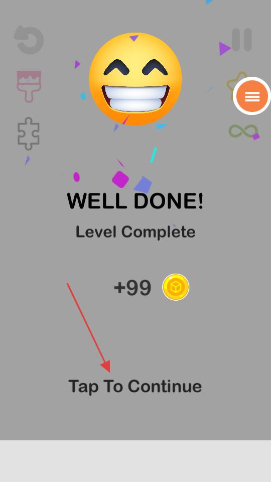 2完成初始关卡后,会跳转至通关页面,上面会呈现鼓励话语、关卡已完成的提示以及99枚金币的奖励信息,点击页面上的继续按钮,就能进入到关卡选择的界面。