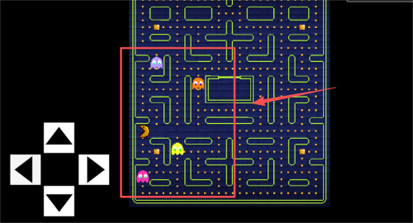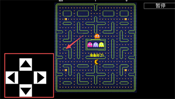 2、迷宫场景沿用经典吃豆人布局,玩家可借助左侧红色边框的方向键操控黄色吃豆人的移动路径,若遇紧急状况,点击右上角的暂停键即可冻结游戏进程。