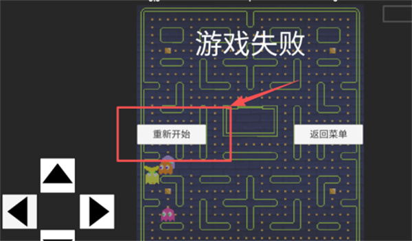 4当角色被幽灵抓住后,游戏会进入结算页面。此时点击带有红色边框的“重新开始”按钮就能直接继续游戏,而页面右侧的菜单按钮则可以让玩家退出当前迷宫,去选择其他关卡进行挑战。