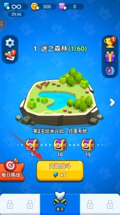 1、进入主界面后,找到并点击“开始战斗”按钮,此时会消耗5点蓝色道具,随后即可进入“迷之森林”第1关,开启这场冒险。