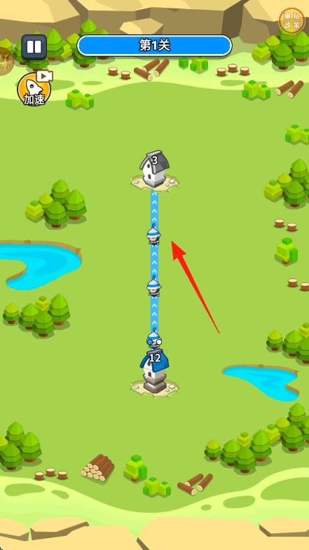 3不断从我方蓝色建筑中派遣兵力,顺着箭头指示的路径发起攻势,逐步夺取所有建筑以获取最终胜利。
