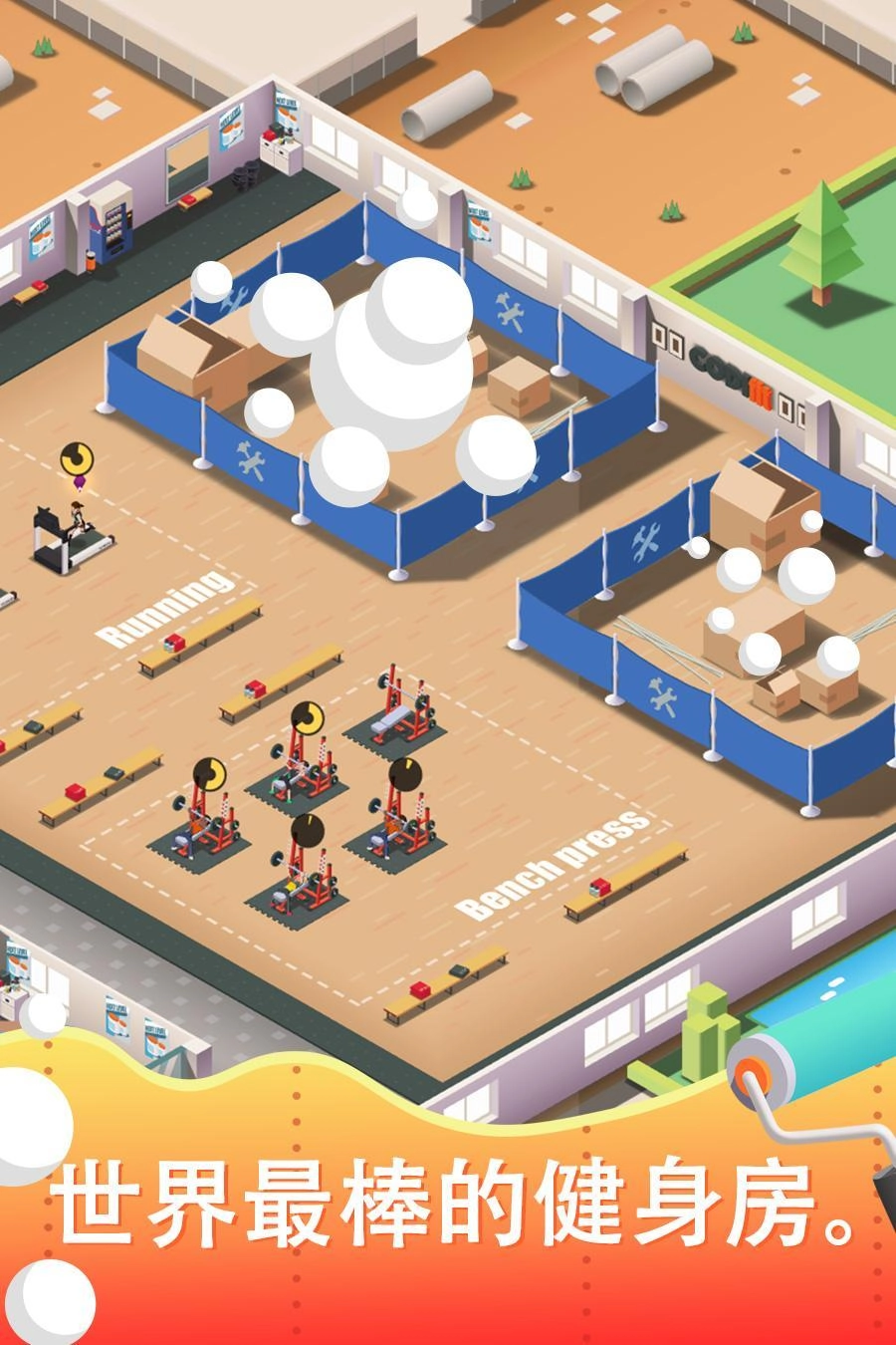 1、趣味卡通的游戏画风,在这里燃烧你的脂肪,升级你的器材吸引顾客前来;