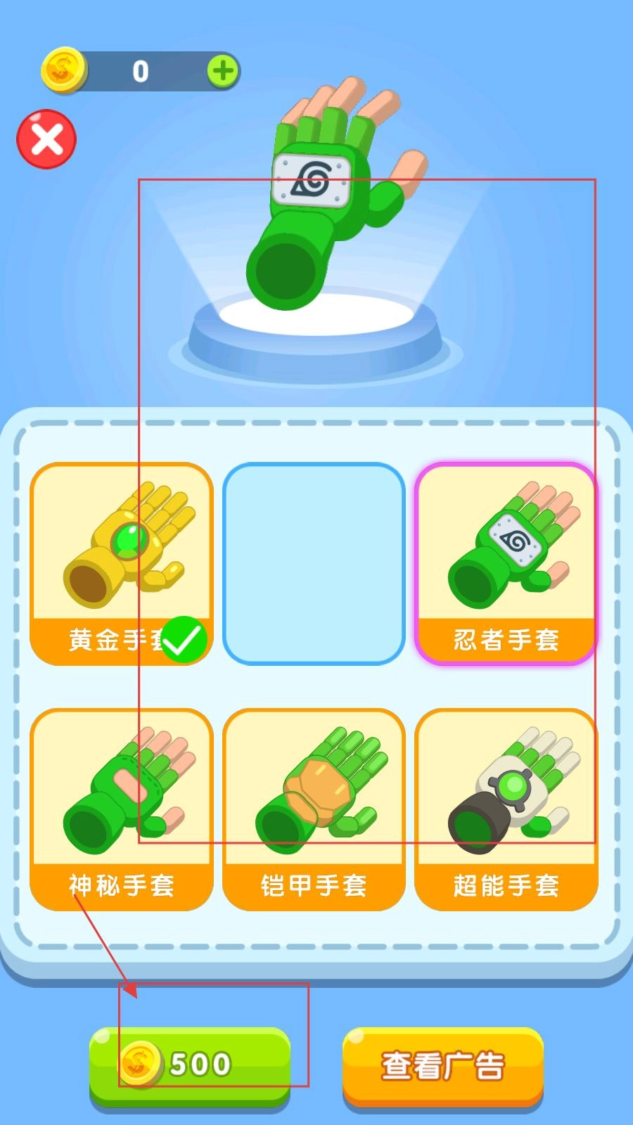 1游戏内设有多种类型的手套道具,像黄金款式、忍者风格等,玩家可消耗金币解锁这些手套,从而在闯关过程中获得帮助。