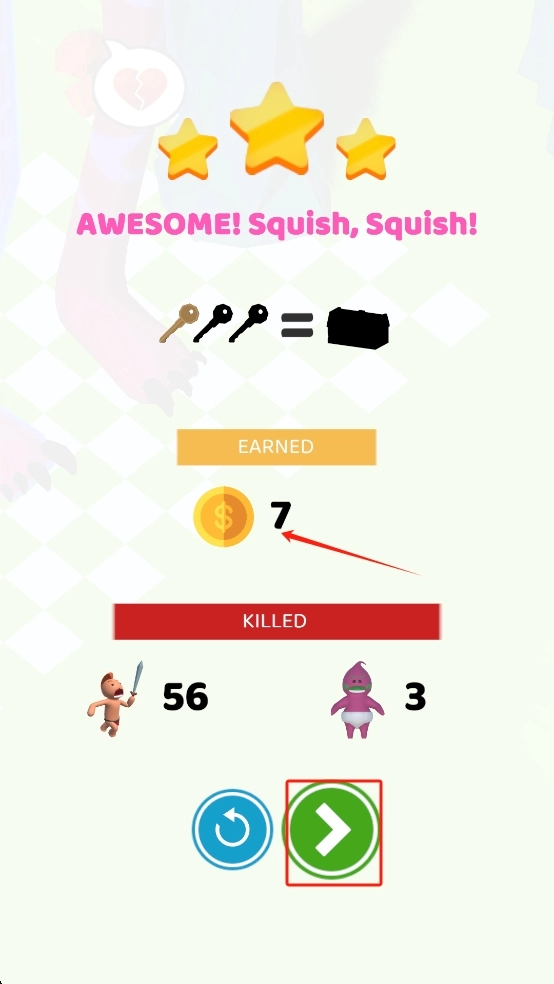 3、关卡结算完成后,点击底部的绿色箭头按钮,即可进入下一关。在此过程中,你可以积累金币和击杀记录,挑战更为复杂的场景。