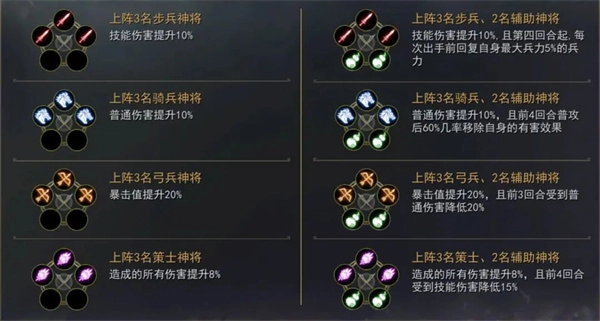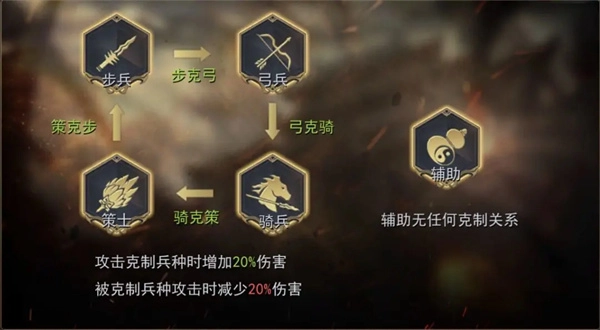 游戏里的兵种分为步兵、弓兵、骑兵、策士和辅助这五种,它们的克制规则是步兵克制弓兵,弓兵克制骑兵,骑兵克制策士,策士克制步兵,而辅助兵种不存在克制与被克制的关系,主公得根据敌对玩家的阵容来合理搭配自己的武将。