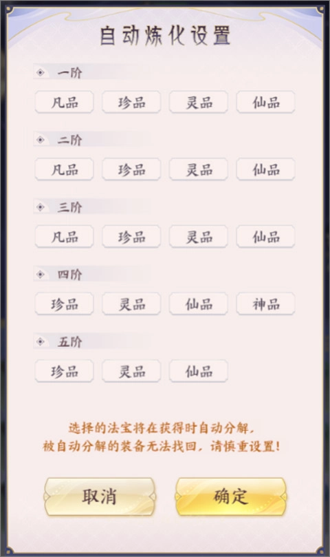 同时,还能借助【自动炼化】功能,设定自动分解的法宝等阶,一旦获得对应等阶的法宝,就会自动分解成祭炼晶石。