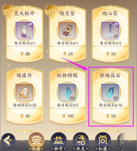 道友可通过消费仙晶,进行祭炼晶石的购买