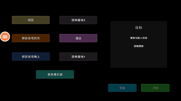 控制角色移动至门口位置,就能进入地图选择界面,像下面图片展示的那样,这里提供了郊区、酒店等七款不同类型的地图。