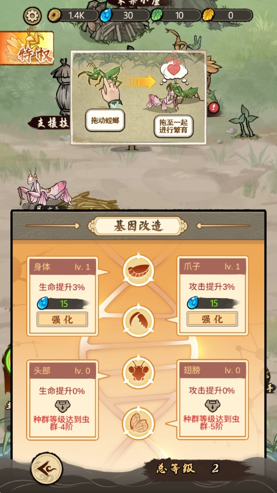 进入游戏后,第一步是通过繁育来获取更多螳螂,具体操作是拖动两只螳螂使其重合。