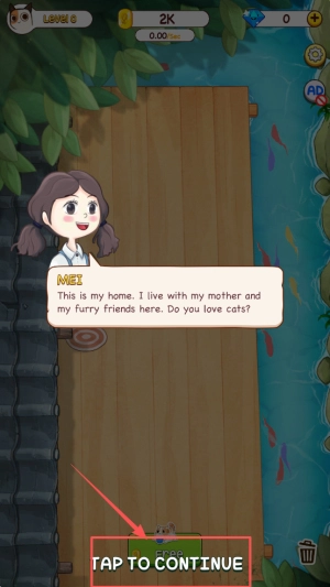 2、在「Level 0」界面点击「TAP TO CONTINUE」按钮跳过剧情,从而知晓这里是猫咪的家。