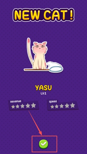 4、当界面显示「NEW CAT! YASU LV.2」时即可马上解锁,解锁后能以五星速度提升收益获取金币,后续循环升级时观看广告还可让收益翻倍。