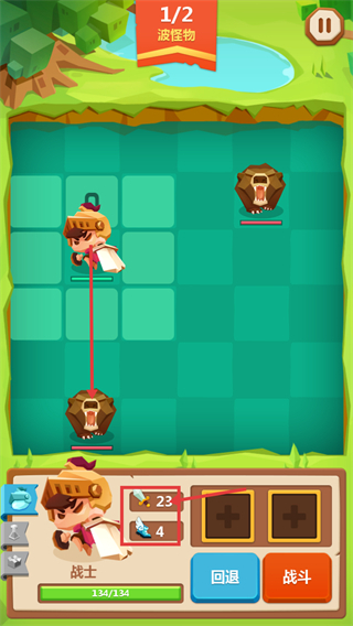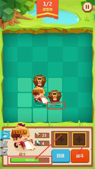 2、战斗时留意【1/2-波怪物】,借助战士【23-攻击】【4-速度】的属性,观察怪物布局后准备发起进攻。