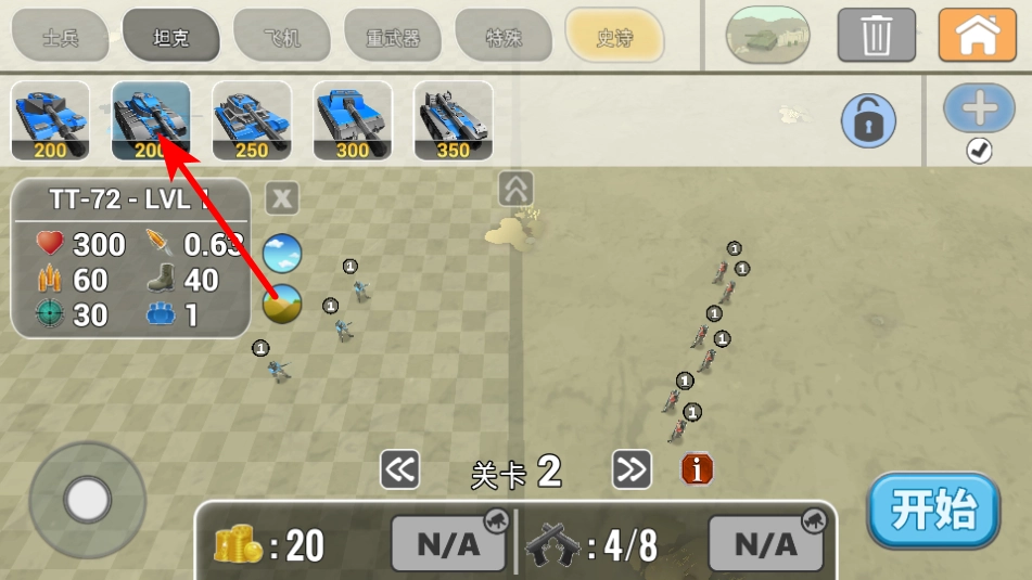3、在部队选择界面,点击TT-72坦克即可将其编入阵容,该坦克拥有较高的生命值与输出能力,能够有效承担伤害并对敌方单位发起打击。