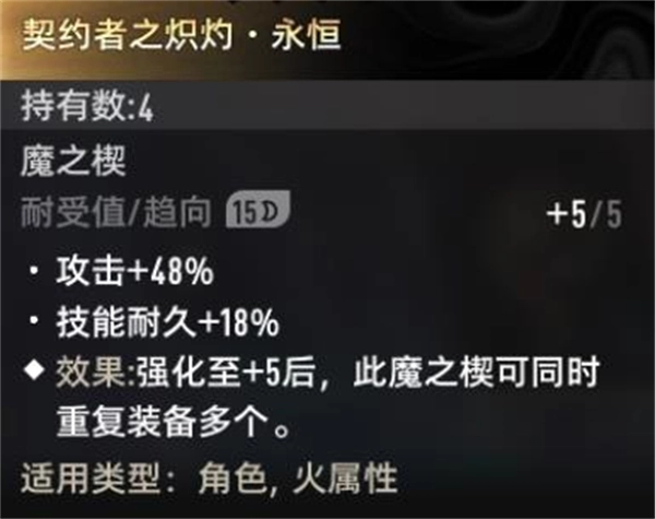 3、通常情况下,同名的魔之楔是不能同时装备的,而且部分同系列的魔之楔之间也可能存在冲突。不过有一个例外——契约者套系列的魔之楔,该系列明确标注了允许重复装备多个,只要将其强化到+5就能实现多件装备。但要留意:即便不同品质的契约者套都强化到了+5,也不可以混合装备。