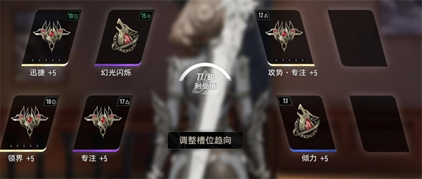 2、魔之楔的耐受数值右侧设有一个图标,用于标识其趋向类型。除无类型外,共有三角、月牙、菱形、圆圈四种趋向。在魔之楔装备界面中,可通过点击调整槽位趋向,来更改任意装备格的魔之楔趋向设定。当在已调整趋向的装备格上安装魔之楔时,若两者趋向相同,耐受值消耗将减半;若趋向不同,耐受值消耗则增加25%(计算结果小数点向上取整)。游戏后期出现的紫色与金色魔之楔,耐受值可能达到20+甚至30+,此时调整装备格趋向就成为必要操作,否则耐受值上限必然无法满足需求。